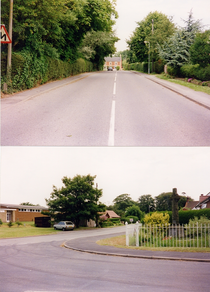 The bottom photograph is taken from Church Lane towards the Village Hall on the left and War Memorial on the right.