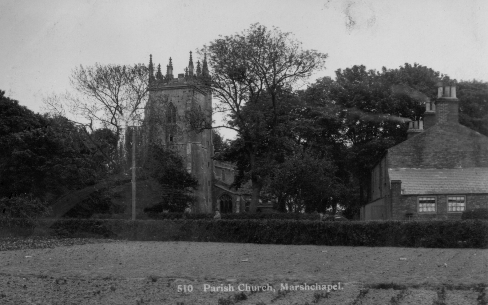 St. Mary's Church, Marshchapel with the cottages clearly shown on the right of the picture. This scene would have been taken from a postcard.