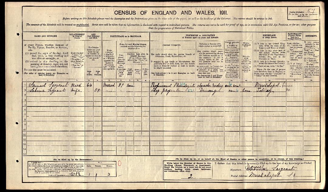 1911 Census record for the family of Samuel Sargeant.