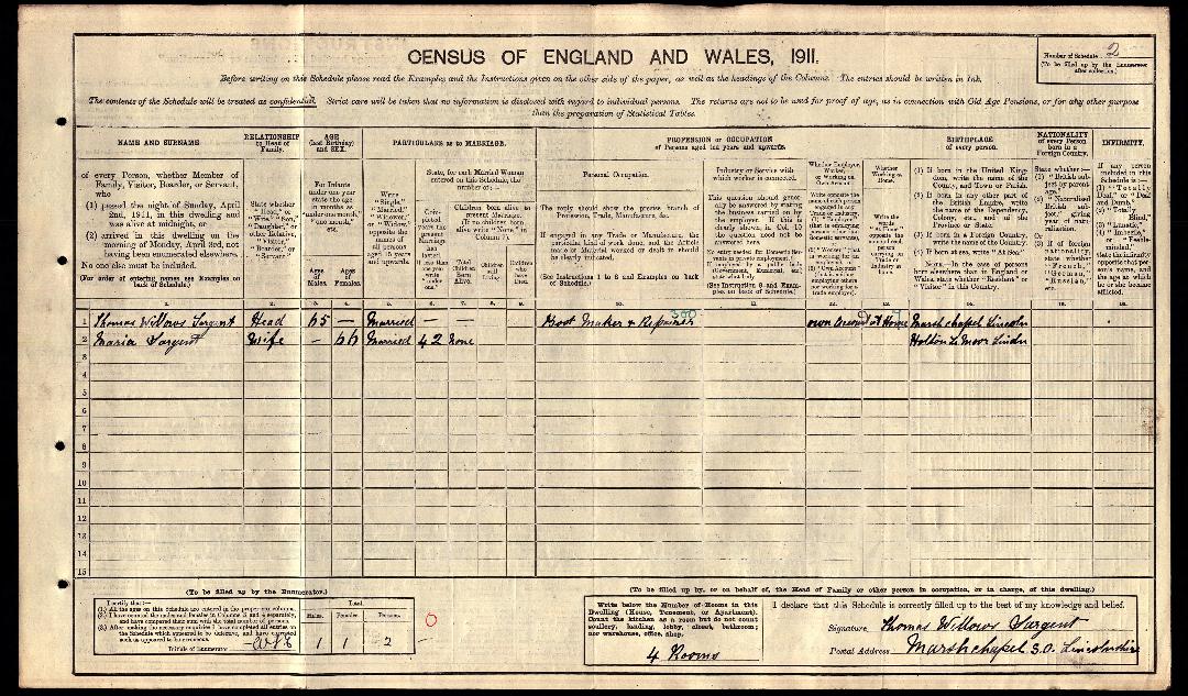 1911 Census record for the family of Thomas Sargent.