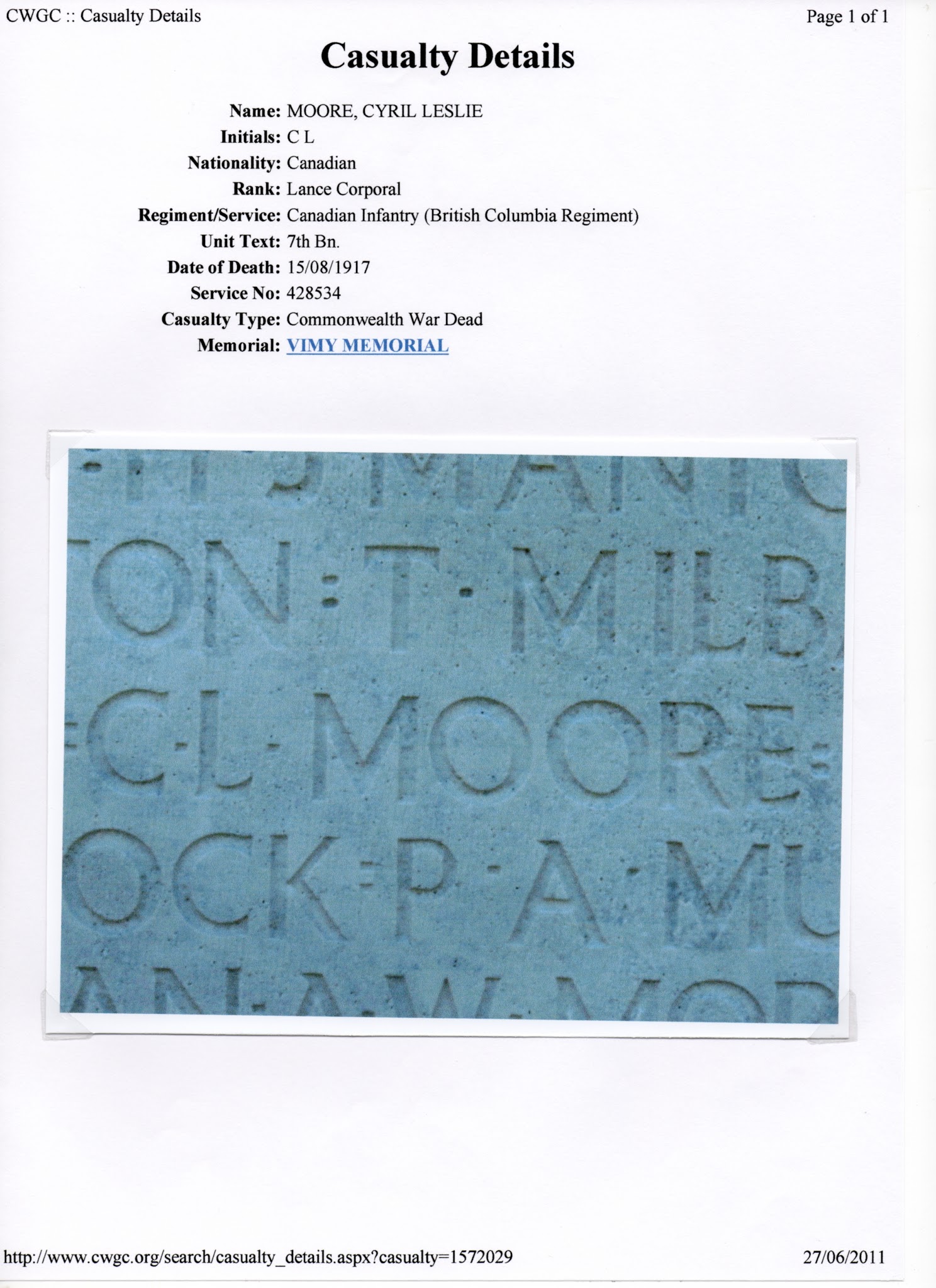 Lance Corporal Cyril Leslie Moore