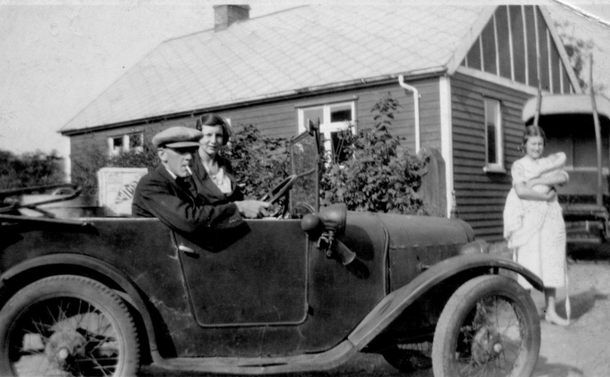 This photograph shows Henry Marshall, who owned the corner shop on Sea Dyke Way and Littlefeld Lane, sitting in his car outside the blue bungalow which used to stand in Littlefield Lane, to the rear of his shop. A house now stands on this site. To the right of the photograph the lady with the baby is Beattie, Henry's first wife, who sadly died as a result of a fire. Their son, Charles survived.