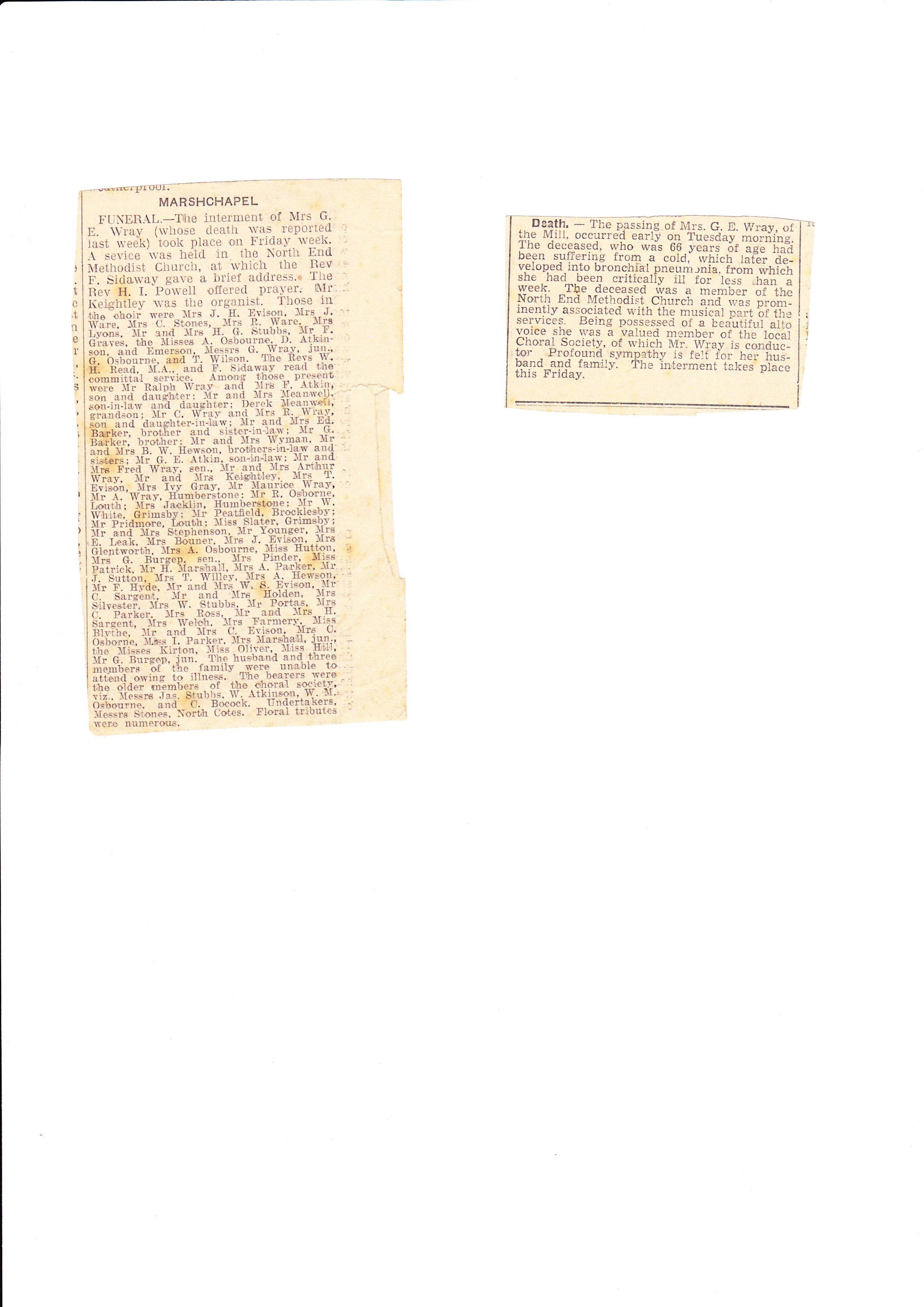 Funeral notice of Mrs G E Wray of The Mill, Marshchapel. Undated