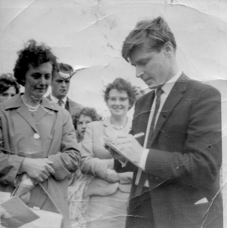 Ena Smith - left - and Jean Horry - centre- getting the autograph of William Roach who plays Ken Barlow in Coronation Street.