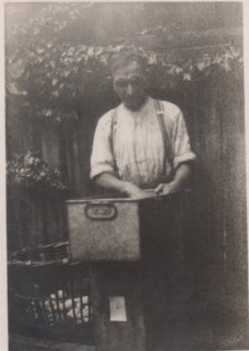 This photograph shows Alf peeling potatoes by hand for the Fish & Chip Shop he ran.