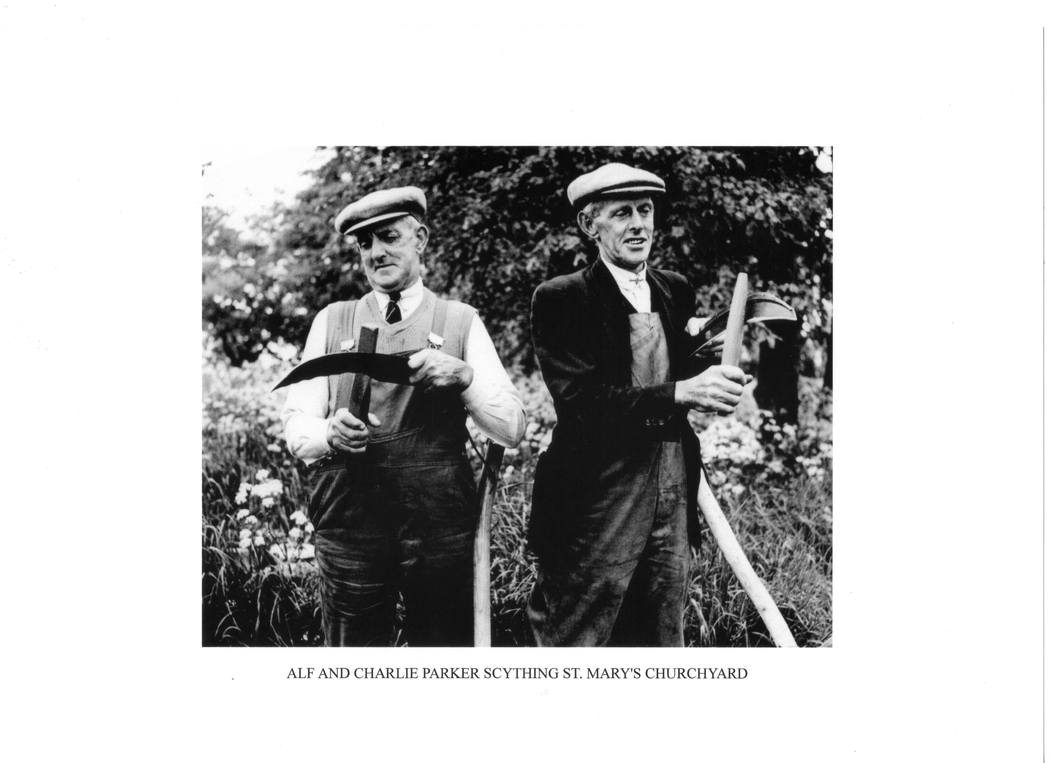 Alf and Charlie Parker sharpening their scythes before starting on the Churchyard.