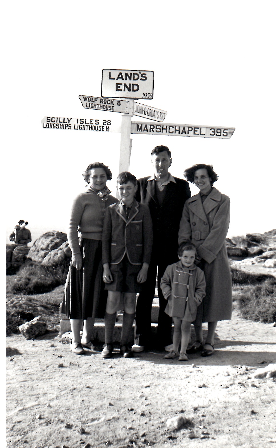 L to R: Margaret Burgess, her son Ian, Raymond Burgess and Winnie Patrick, Margaret's sister, with Margaret and Raymond's daughter Angela at the front.