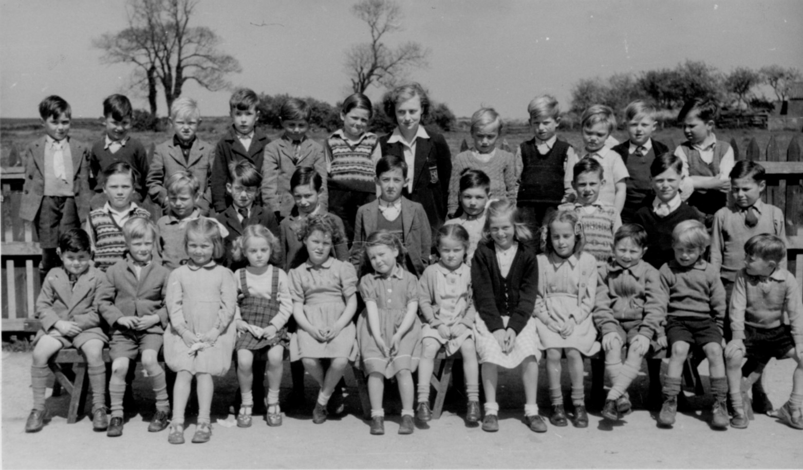 Back row: David Scrimshaw, Richard Marshall, Graham Hockney, David Evison, Trevor Clover, Raymond Wilson, Miss Daphne Campion - Infant Teacher - Wright, first name unknown, John Worrell, Unknown, Walter Brooks, Mick Grantham.