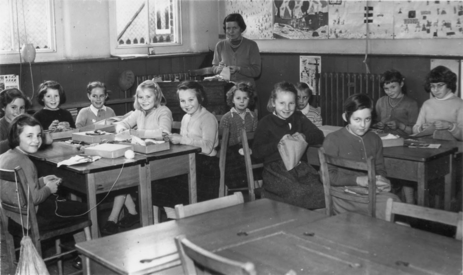 Next table: Kay Leak, Linda Lovett, Rosemary Williams - daughter of teacher - near the radiator is Joyce Wright, Janet Scarborough, Linda Leak.