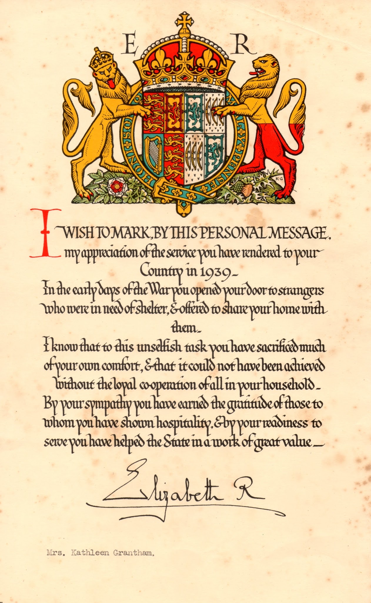 A certificate sent to Kath Grantham in recognition of taking in evacuees during WW2.