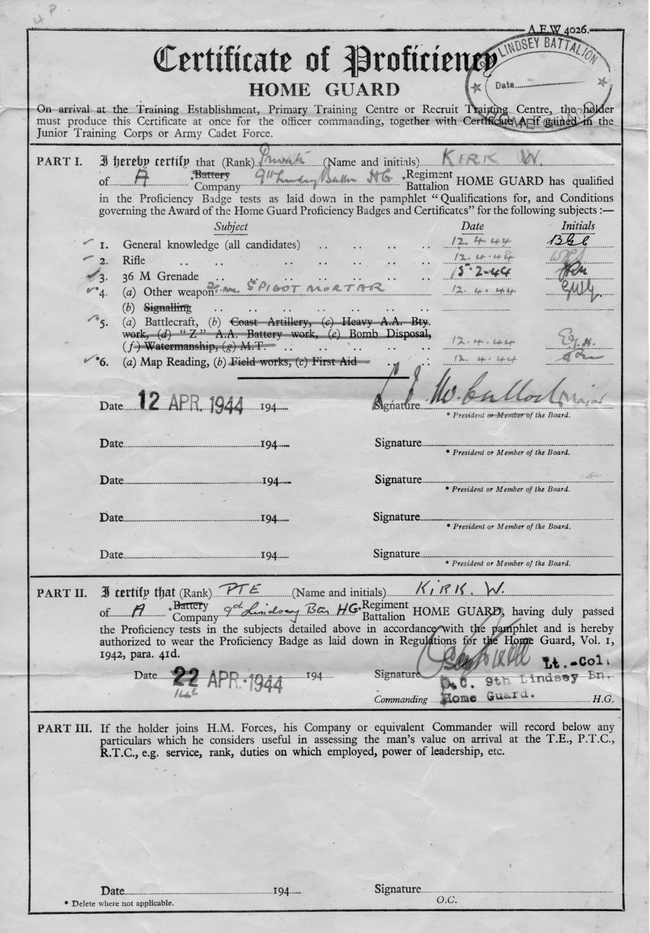 Certificate of Proficiency awarded to Walt Kirk - Home Guard - 22 April 1944