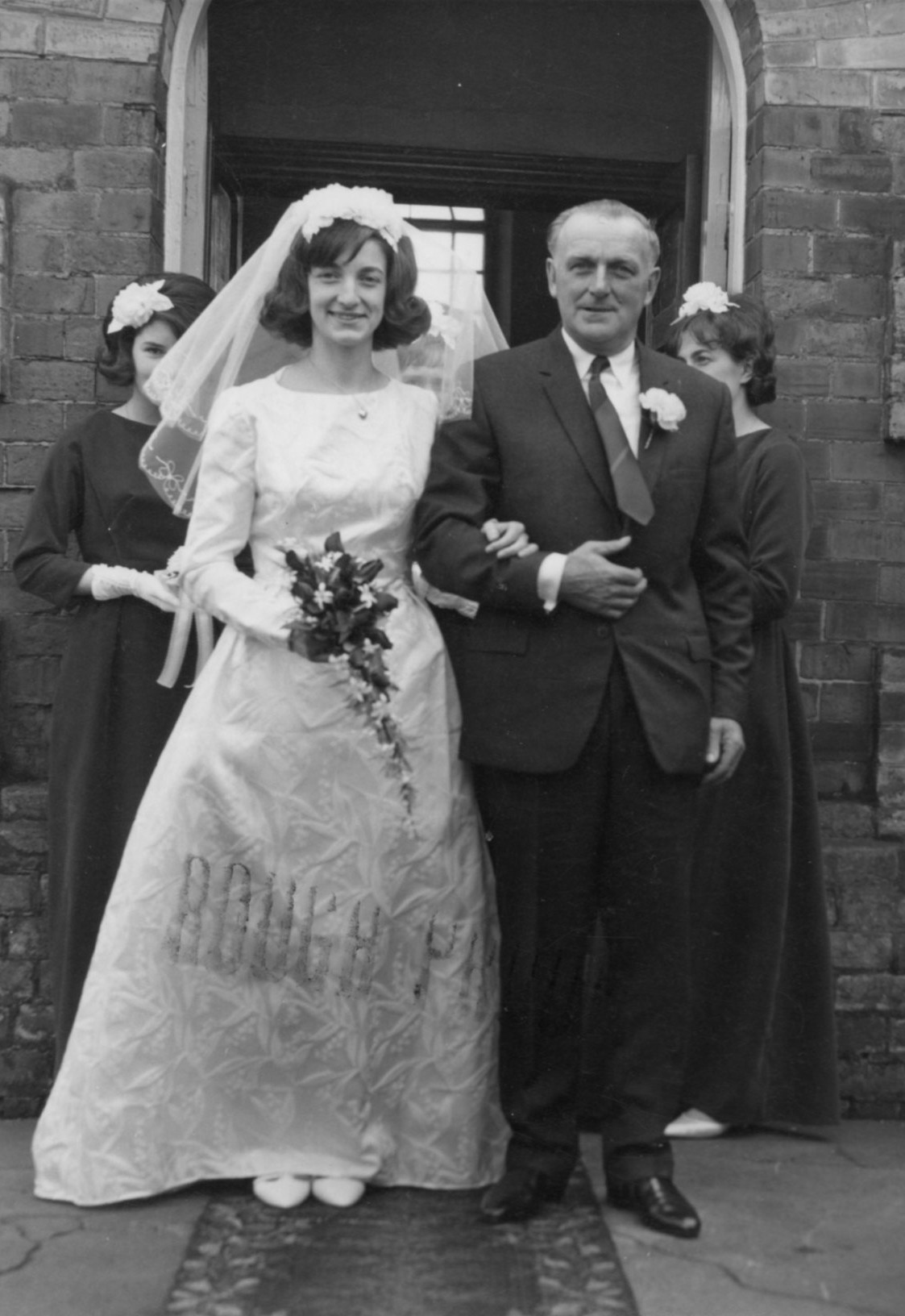 She is on the arm of her father George and the bridesmaid on the right is her sister Janet.